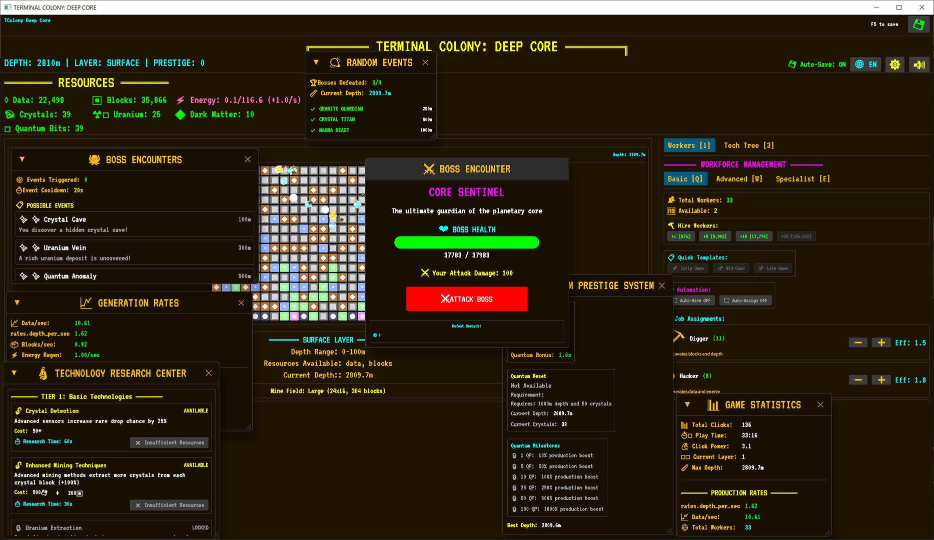 - Системы автоматизации: квантовый экскаватор, рой дронов (×5 эффективности) и AI Core (+10% за каждое ядро).