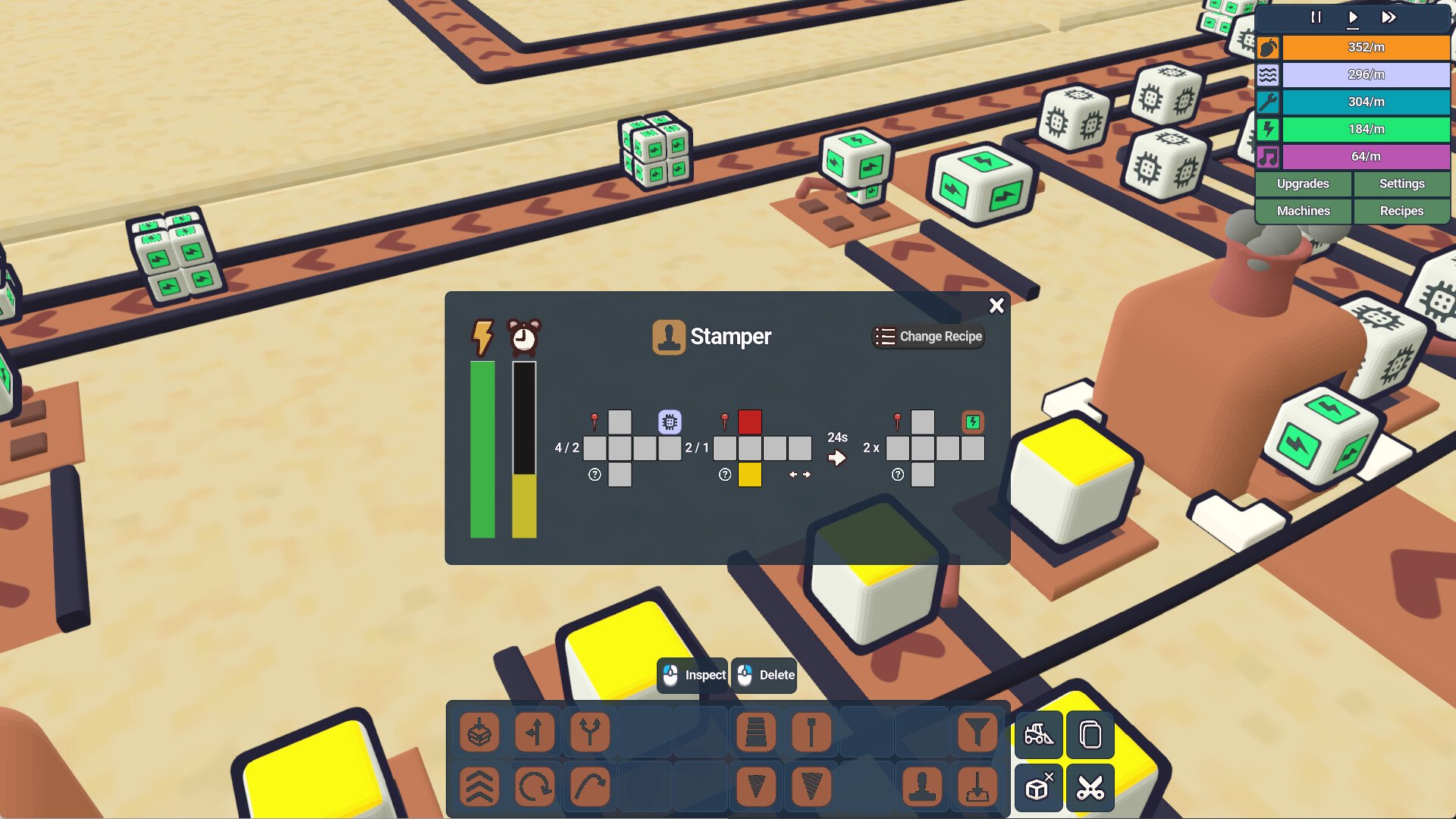 Особая механика - производство на основе окрашенных кубов и центрального ПИТа: всё, что вы создаёте, - это кубы, которые попадают в ПИТ. На ранних этапах это простая добыча и покраска кубов по нужным шаблонам, но вскоре появляются сложные цепочки сборки, побочные продукты и недетерминированные процессы, требующие тонкой настройки.